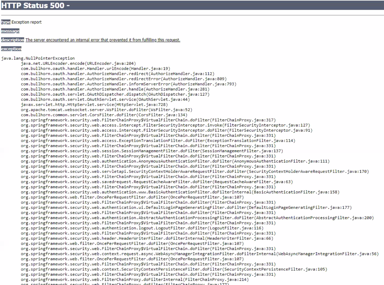 When the error message below appears this indicates that Bullhorn is having issues with their API. Please wait one hour and retry to authorize your connection.
