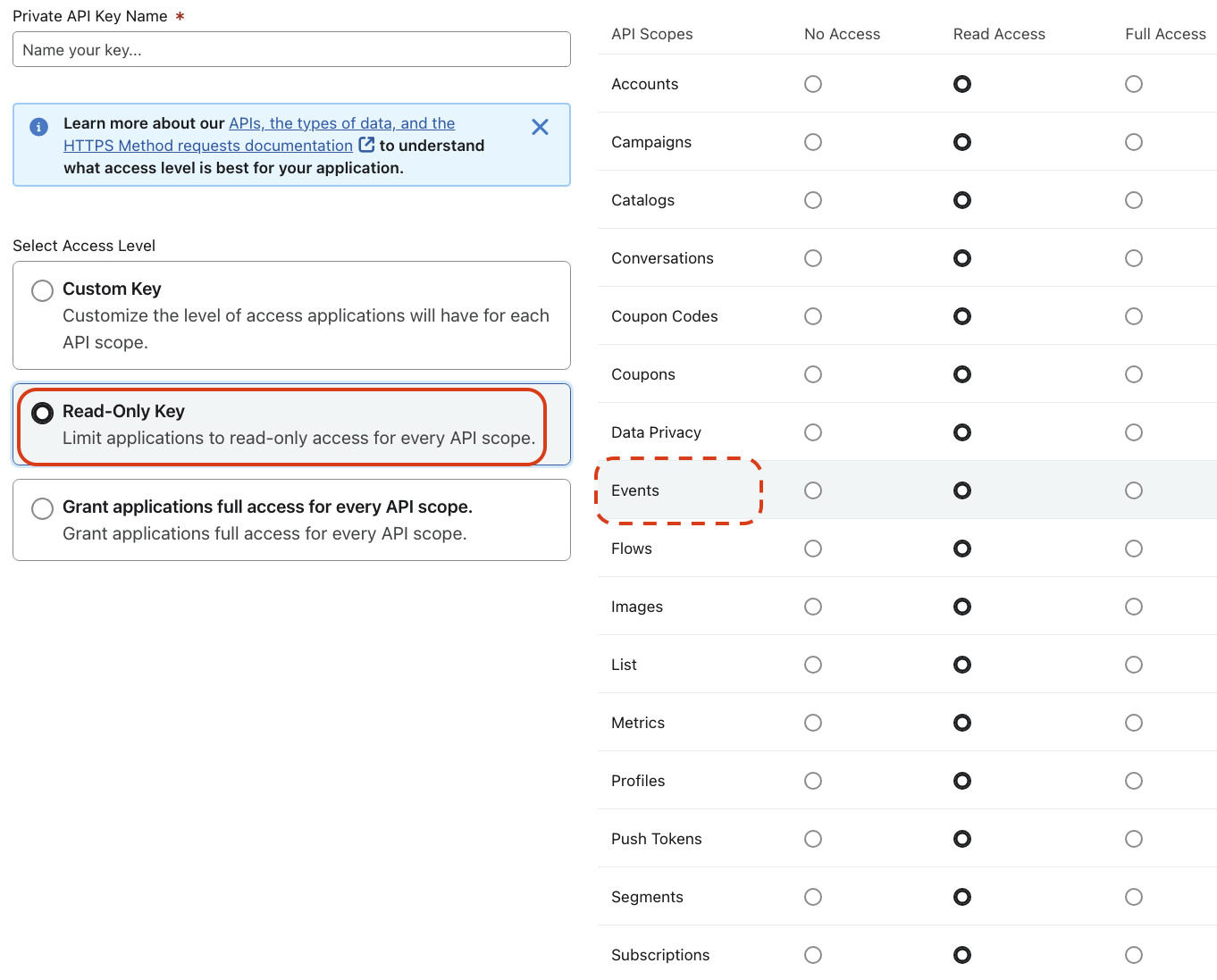 - Provide the required Access Level and API Scopes. We recommend you to provide the Read-Only Key access level for all the endpoints if you want to sync all tables. You can also provide the access and scopes based on the endpoints you want to sync.