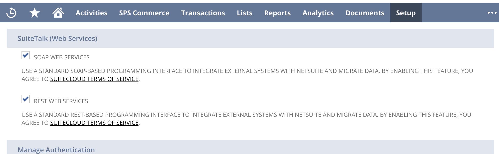 - Under the SuiteTalk (Web Services) section check the checkboxes for: