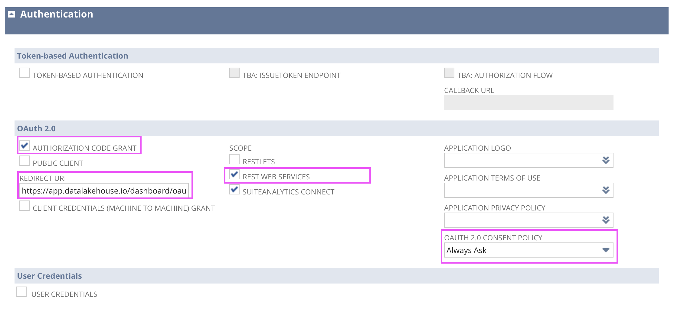 - A user assigned a role with the OAuth 2.0 Authorized Applications Management permission cannot access RESTlets, REST web services, and SuiteAnalytics Connect using OAuth 2.0. To use OAuth 2.0 for access, the user must be assigned a role with the Log in Using OAuth 2.0 Access Tokens permission.