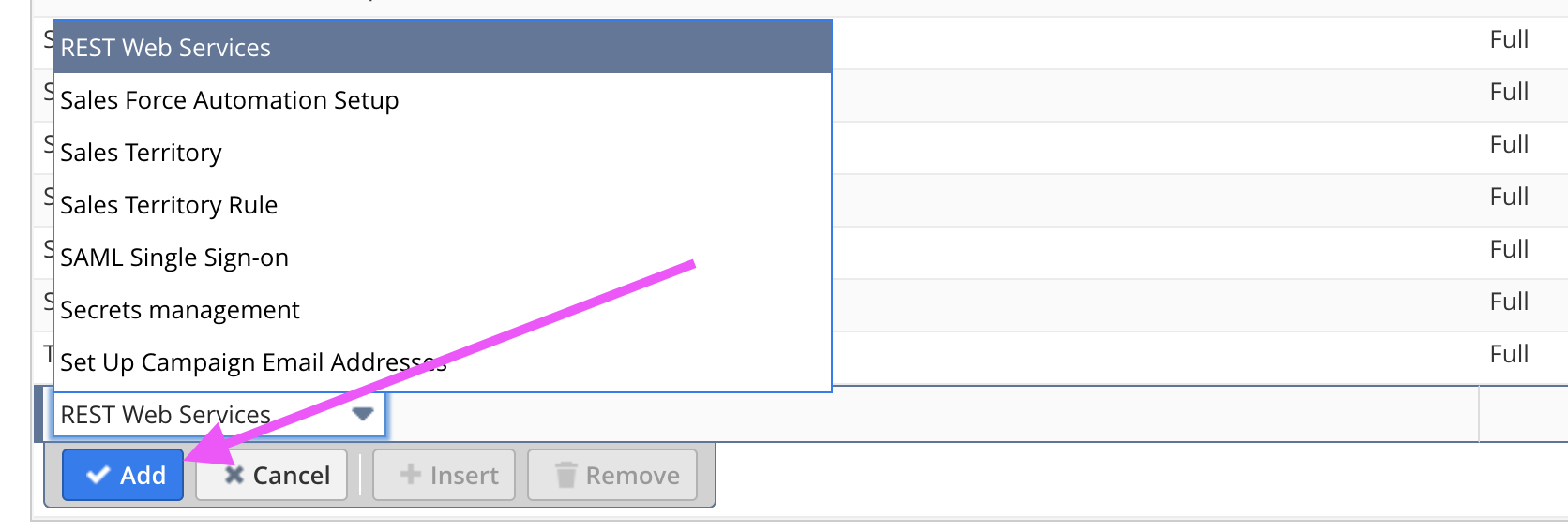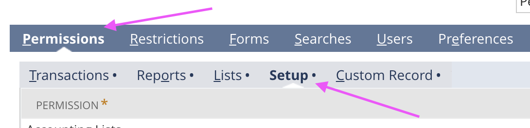 NOTE: If updating any existing role to add these permissions necessary for the OAuth 2.0 access, find the role, click to edit the role, then in the sub tab click on Permissions > Setup then below you will be able to add the new permission as follows: