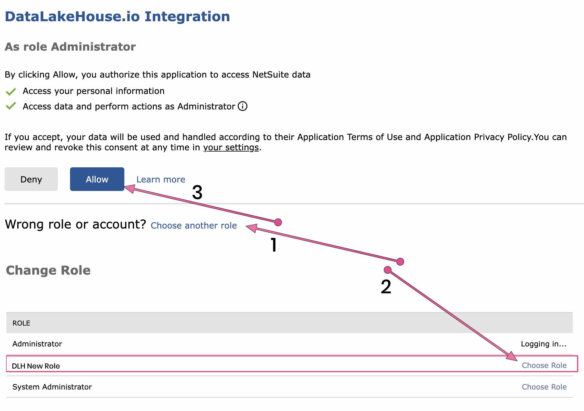 When the DLH.io connection is first created and authenticated you are redirected back to your NetSuite account and have the ability to select the role which you will access the NetSuite REST API through, and that role needs to have the appropriate access.