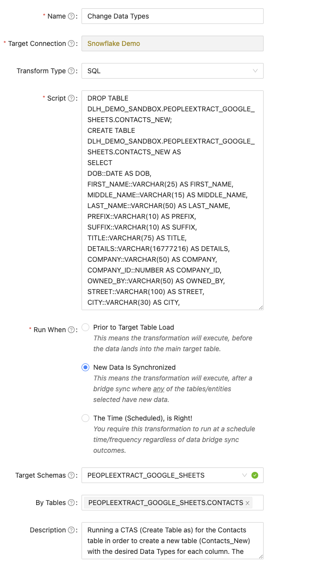 In the example below, a Sync Bridge is syncing a Google Sheet into Snowflake. In order to control the column data types in Snowflake, a Transformation is created to drop the CONTACTS_NEW table at the end of each Sync Bridge run and then a CTAS is executed to create the CONTACTS_NEW table with the desired column data types.