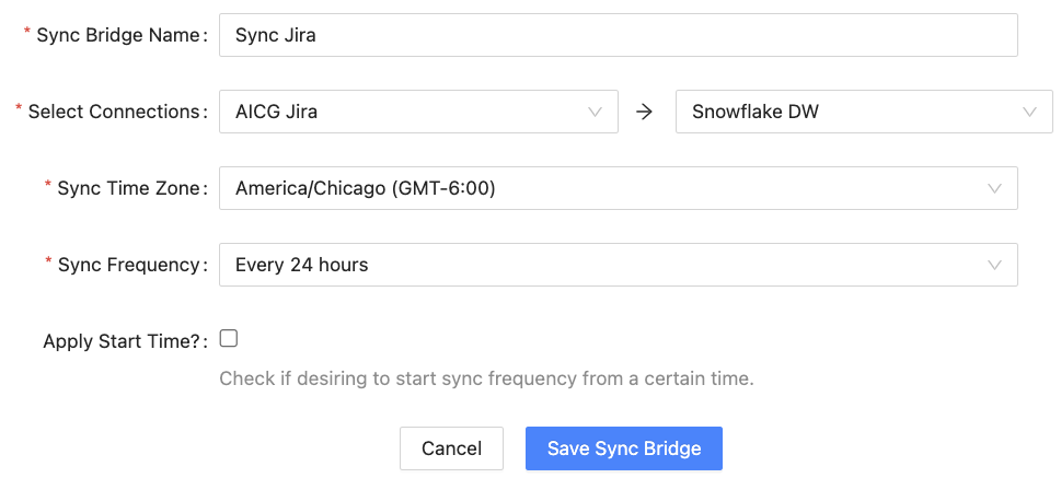 - Set the Frequency of how often the bridge should run. The frequency should be set relative to how much data you are syncing on each run relative to how often do users want to see refreshed data. Setting the Frequency to less than one hour requires you to be on the Enterprise or higher plan and a conversation with your DLH.io account manager.